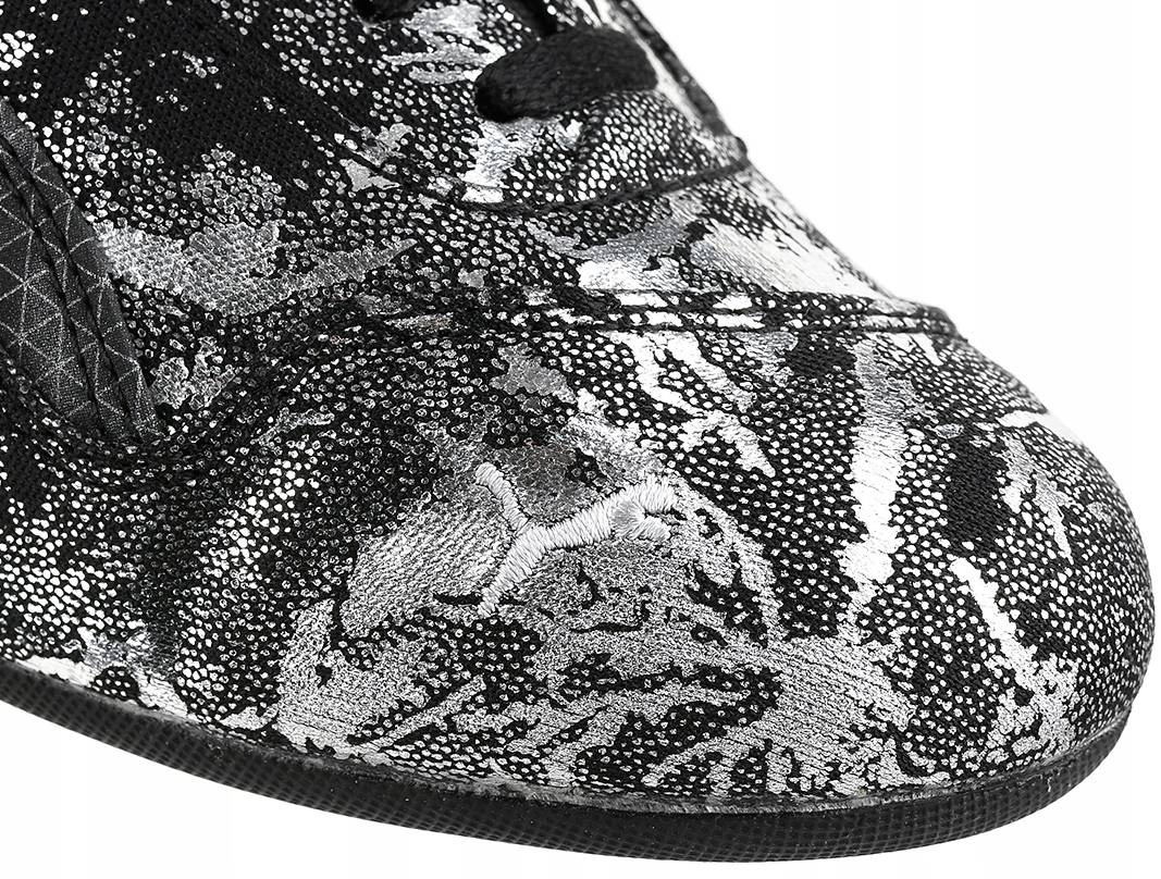 - Z zewnątrz buty pokryte metalicznym, dynamicznym wzorem, który zdecydowanie przyciąga wzrok i sprawia, że buty prezentują się wyjątkowo